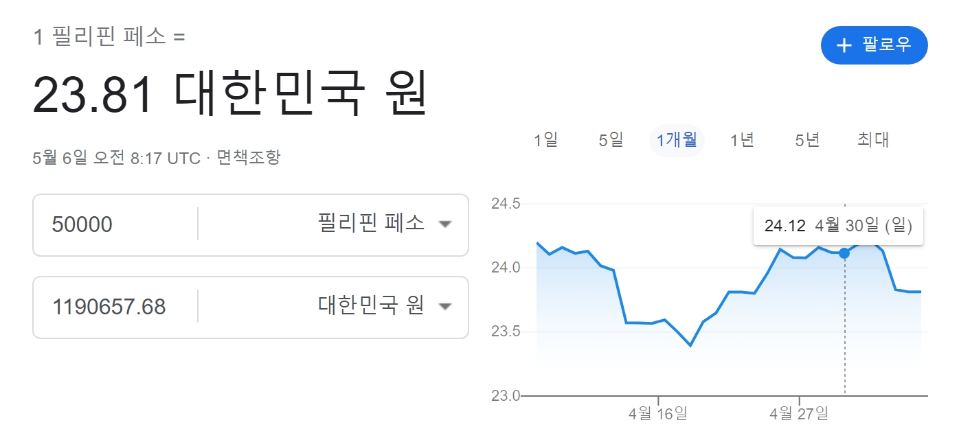 5만페소는 대략 오늘자 환율로 120만원이 조금 못 미치는 금액이 되네요.